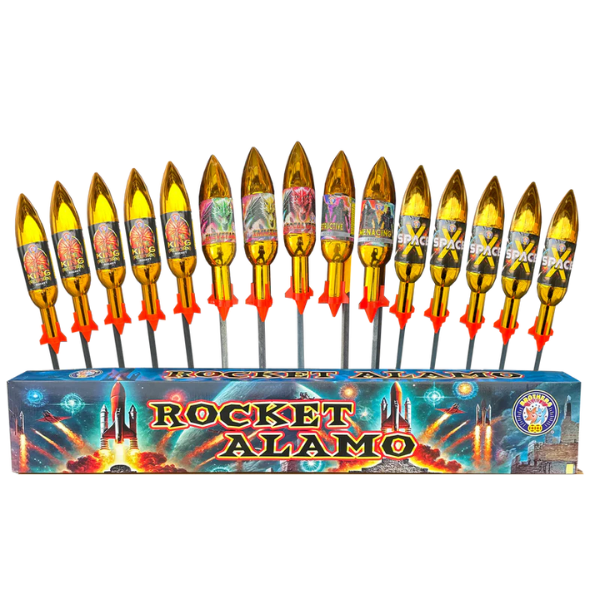 Rocket Alamo by Brothers Pyrotechnics (NEW for 2025) – A 15-pack of XL rockets, including 5 × Space X, 5 × King Reborn and 5 × assorted big rockets. Each rocket is loaded with the maximum 180g of powder for colossal sky breaks.