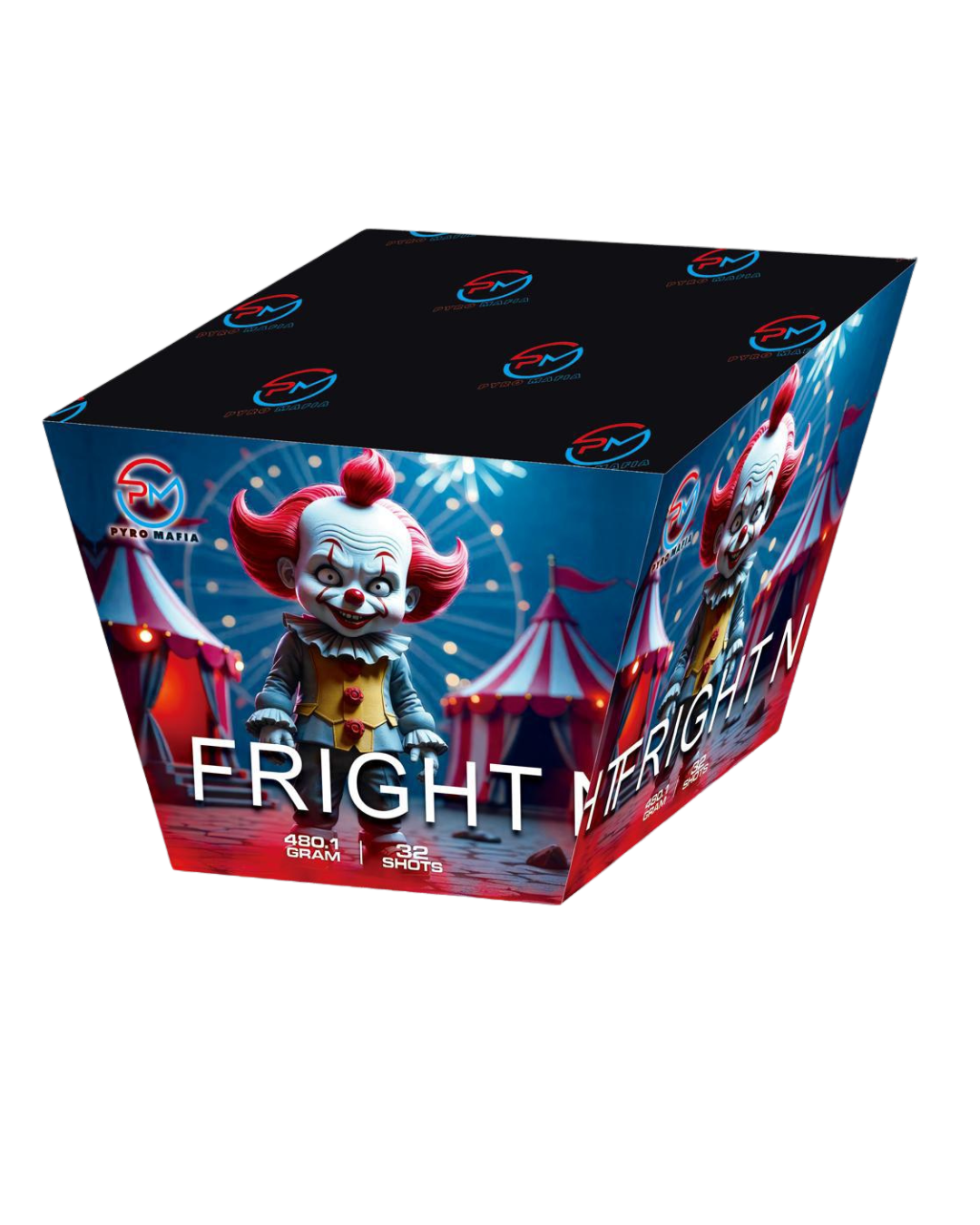 Dare to enter the circus of screams with Fright Night, a spine-chilling 32-shot fanned barrage that delivers thrills from the very first spark. Starting with a spooky fountain that crackles like the laughter of a sinister clown, this firework then erupts into a dump cake of rapid fanned volleys, filling the night sky with bursts of colour, crackles, and eerie brilliance.
