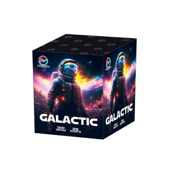 Launch your celebration into orbit with Galactic, a brilliant 25-shot straight-firing barrage firework that dazzles with cosmic energy. Each shot erupts into the sky with towering palm bursts and golden brocade breaks, while shimmering strobes and elegant chrysanthemums light up the night in a breathtaking sequence.