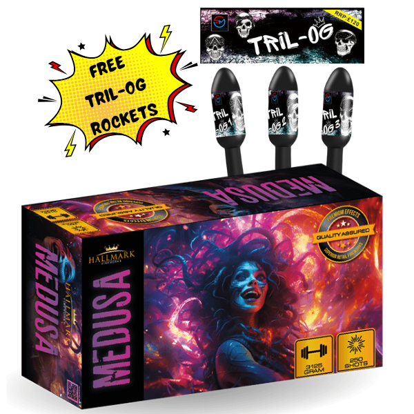 Lasting for several minutes, this firework dominates the horizon and delivers a professional-quality spectacle worthy of any major event. As an added bonus, every purchase includes a FREE pack of Tril-OG Rockets, giving you even more explosive value. Perfect for Bonfire Night, New Year’s Eve, weddings, birthdays, and large-scale celebrations, this compound guarantees a show your guests will never forget.