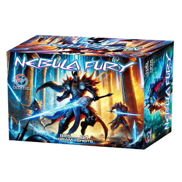 Ignite the cosmos with Nebula Fury, a stunning 100-shot compound firework that delivers cosmic power in every burst. From the first ignition, this spectacular fan cake launches vivid reds, blues, and shimmering golds high into the sky, painting the horizon with a dazzling celestial performance.