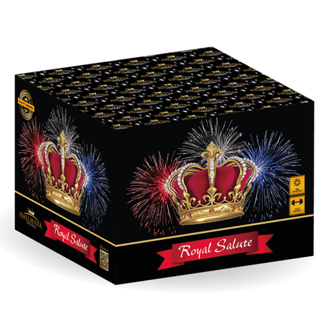 Step into the splendour of the night sky with Royal Salute by Hallmark Fireworks, a truly majestic barrage that delivers fireworks at their finest. Packed with 56 shots and loaded with 700g NEC, this stunning display combines elegance, power, and precision in one regal performance.