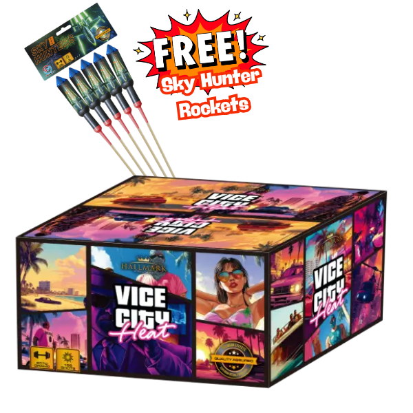 Step into a world of neon lights and high-speed thrills with Vice City Heat by Hallmark Fireworks. This 156-shot compound barrage combines both fanned and straight firing sequences, delivering a display that burns bright, untamed, and unforgettable.